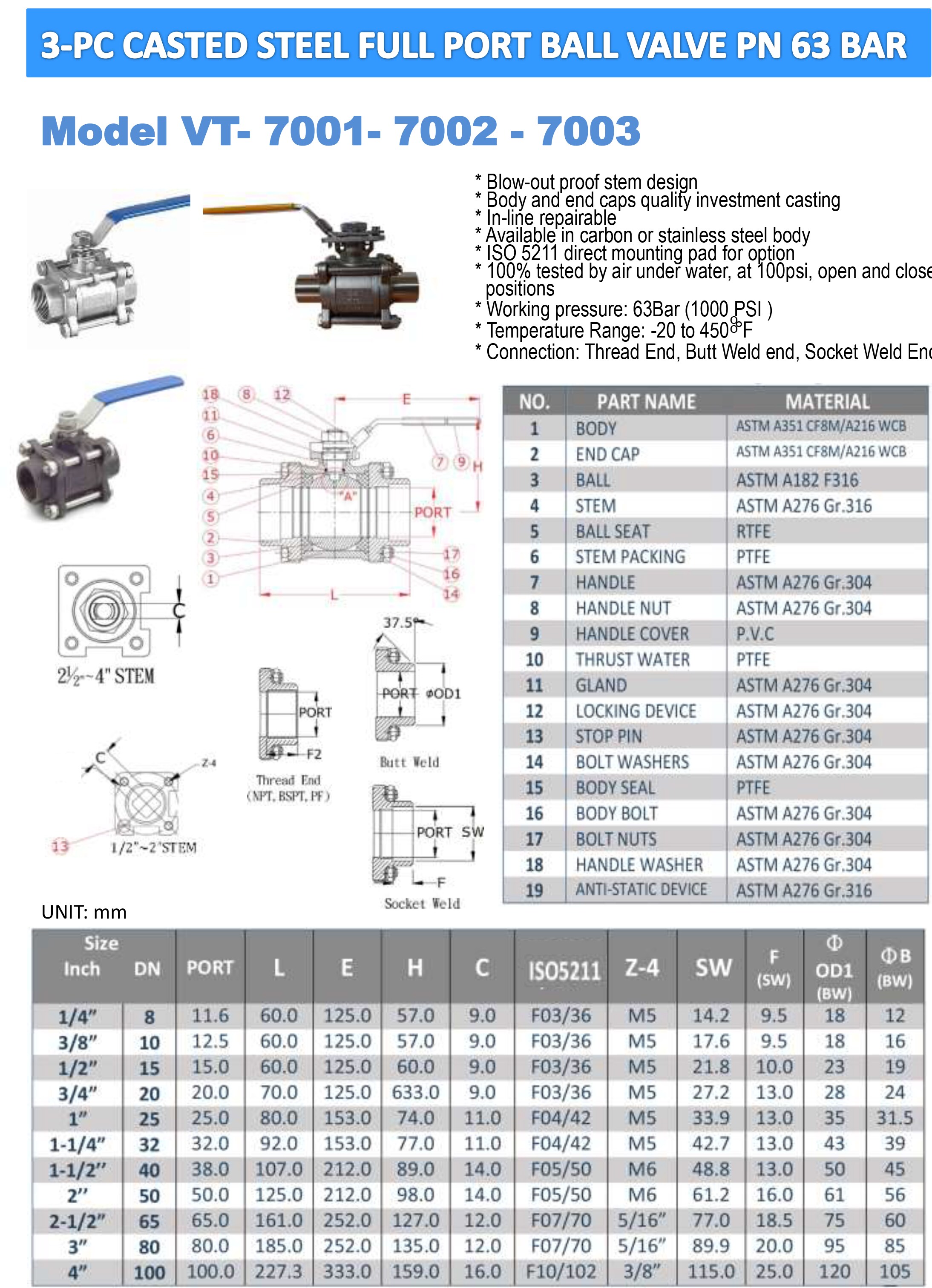 **Vanne à Bille Professionnelle 3 Pièces à Passage Intégral - Acier Inoxydable 316/CF8M** Cette vanne à bille 3 pièces de précision est fabriquée en acier inoxydable premium 1.4408/CF8M/316, offrant une résistance exceptionnelle à la corrosion et une durabilité remarquable pour les applications industrielles exigeantes. Dotée d'une conception à passage intégral pour un écoulement sans restriction, la vanne est fabriquée selon une technologie de moulage par décapage à la cire avancée garantissant des performances supérieures et une longévité optimale. **Spécifications Techniques :** - Pression nominale : PN63 BAR (1000 WOG pour DN8-DN50) - Gamme de tailles : 1/4" à 4" (DN8-DN100) - Plage de température : -20°C à 180°C - Normes : EN12266-1, DIN 3202 S13, compatible ISO 5211 **Caractéristiques Principales :** - Conception de tige anti-éjection pour une sécurité opérationnelle renforcée - Disponible avec raccords à souder bout à bout et à emboîtement - Mécanisme de verrouillage en option - Fonctionnement sans fuite avec exigences de maintenance minimales Idéale pour les environnements industriels nécessitant un contrôle de débit fiable avec une durabilité exceptionnelle et une performance constante.