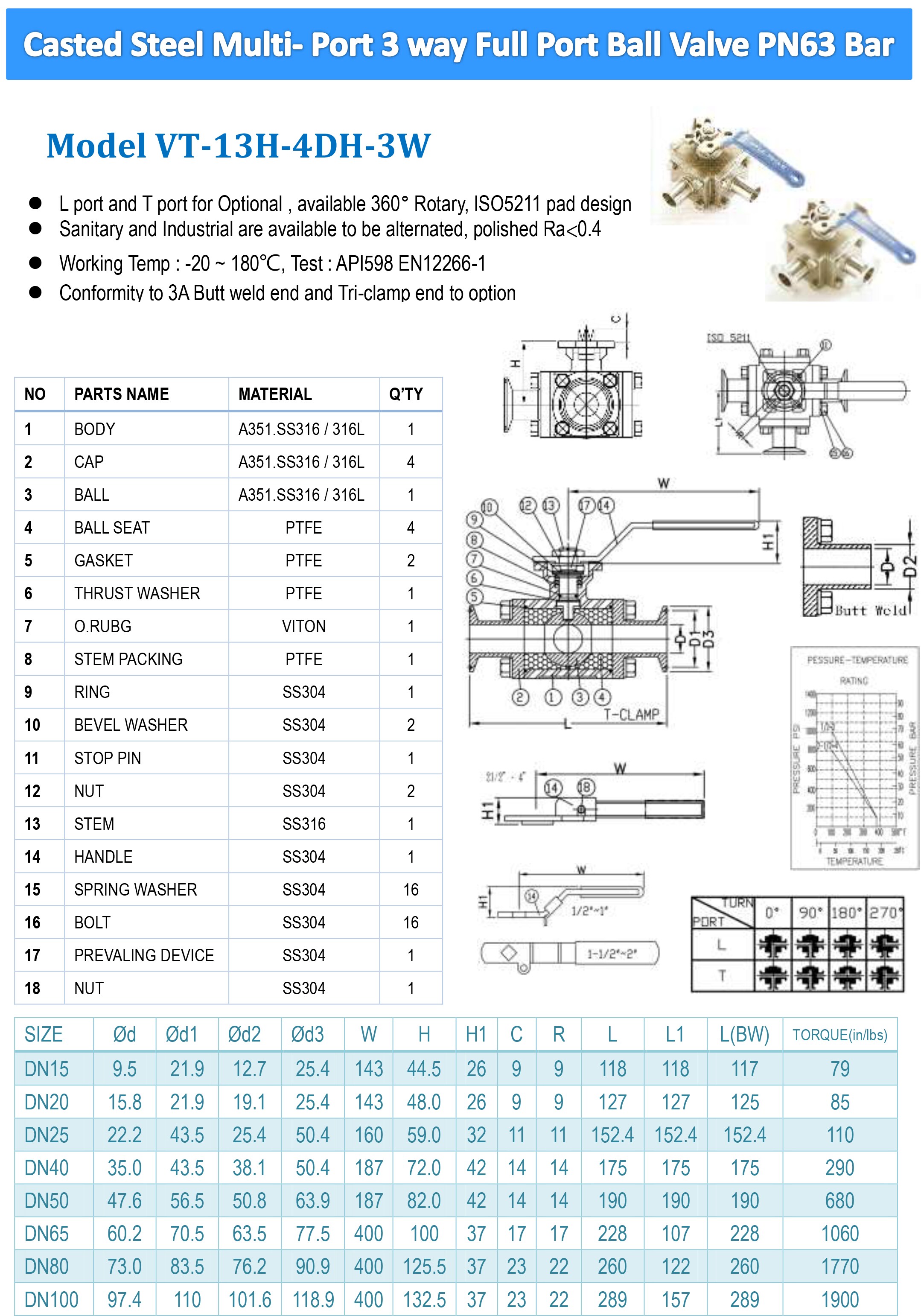 • Vanne à boisseau sphérique 3 voies à passage intégral en acier inoxydable, à commande manuelle, ISO 5211, pression nominale PN63